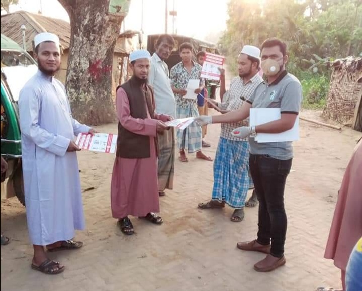 জনসচেতনতায় হলদিয়ার মৌলবী বাজারে লিফলেট বিতরন করছেন ইউপি সদস্য শামশুল আলম।